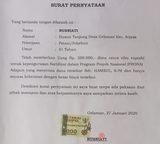 “Kami menerima aduan tentang adanya pungli PTSL dari warga Mas. Surat pernyataannya ada bermeterai, dari masing-masing warga pemohon ditulis biaya sebesar Rp500 ribu,” ungkap Ali.