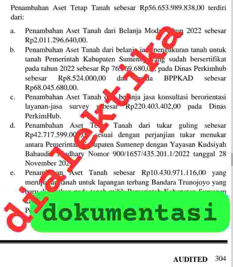 Diketahui media dialektika, penambahan 36.040 m² aset tetap tanah dari tukar guling nilai Rp 42.717.599.000,00 sesuai dengan perjanjian tukar menukar antara Pemkab Sumenep dengan Yayasan Kudsiyah Bahaudin Mudhari nomor : 900/1657/435.201.1/2022 tanggal 28 November 2022, (sumber data catatan dari BPK Provinsi Jatim).