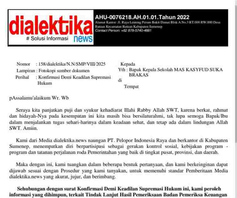 Persoalan itu, media dialektika.news melanjutkan konfirmasi melalui surat konfirmasi tanggal 05 Agustus 2025, kepada Kepala Sekolah Madrasah MAS Kasyifud Duja Brakas, Subhan yang beralamat di Jl. Raya Pelabuhan Panggung No.13, Desa Brakas, Kecamatan Ra’as, Kabupaten Sumenep namun hingga berita ini diterbitkan tidak ada keterangan resmi. (RID)
