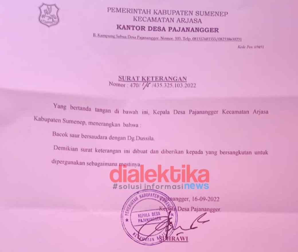 Hasil dari audiensi tim dialektika.news bersama Kepala Desa Pajenangger Suhrawi yang menerangkan bahwa Bacok Saur bin W Saur bersaudara dengan Daeng (Dg) Dussila. Tertulis dalam bentuk Surat Keterangan Nomor: 470/175/435.325.103.2022. Bunyinya, yang bertanda tangan dibawah ini adalah Kepala Desa Pajenangger Suhrawi menerangkan bahwa Bacok Saur bersaudara dengan Dg Dussila, tertanggal 16 September 2022.